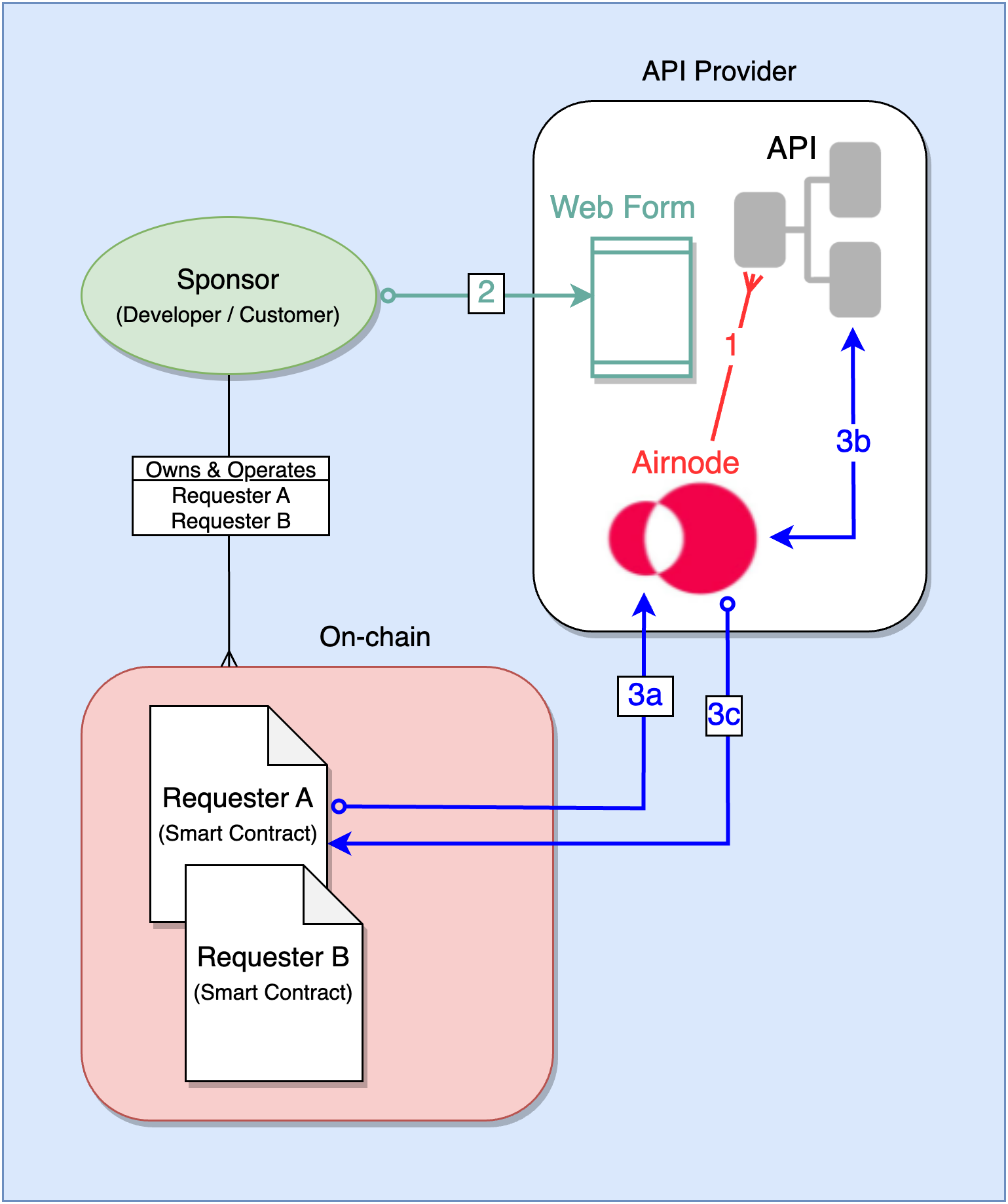 A sponsor is the developer of an on-chain smart contract that wishes to request off-chain data from an API provider. A sponsor has a know sponsorAddress. The API provider can request the sponsorAddress from the sponsor using a webform as part of a paid subscription setup.